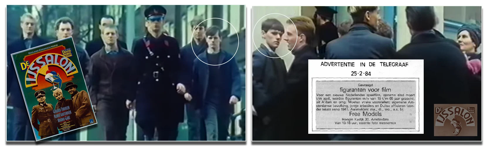 Het lijkt mij ook wel leuk om ‘iets’ met film of tv te gaan doen en dus reageer ik eind februari 1984 op een advertentie uit de Telegraaf waarin er gezocht werd naar figuranten voor de nieuwe Nederlandse Speelfilm DE IJSSALON van regisseur Dimitri Frenkel Frank. De hoofdrollen in deze ‘oorlogsfilm’ waren voor Reneé Soutendijk, Gerard Thoolen en de Duitse Bruno Gantz.