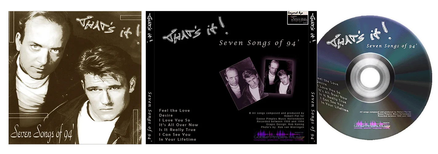 De songs die ik tussen 1989 en 1994 met producer/componist ROBERT POT had opgenomen had ik ook alleen op cassette in mijn bezit. Helaas waren ook deze niet echt meer van hele goede kwaliteit. Toch heb ik ook deze geprobeerd te remasteren en op CD gezet, met hoes erbij ontworpen natuurlijk….